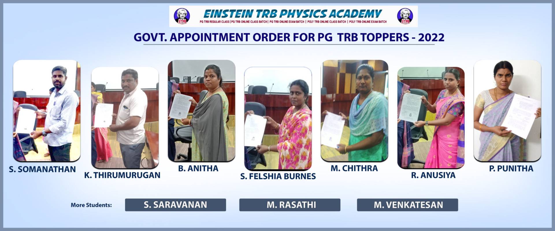 - In the year of 2022 PG TRB has called 23 students for certificate verification(CV). Then 10 students selected in the final list in 2022 PG TRB. (Waiting for Appointment order from TRB).
